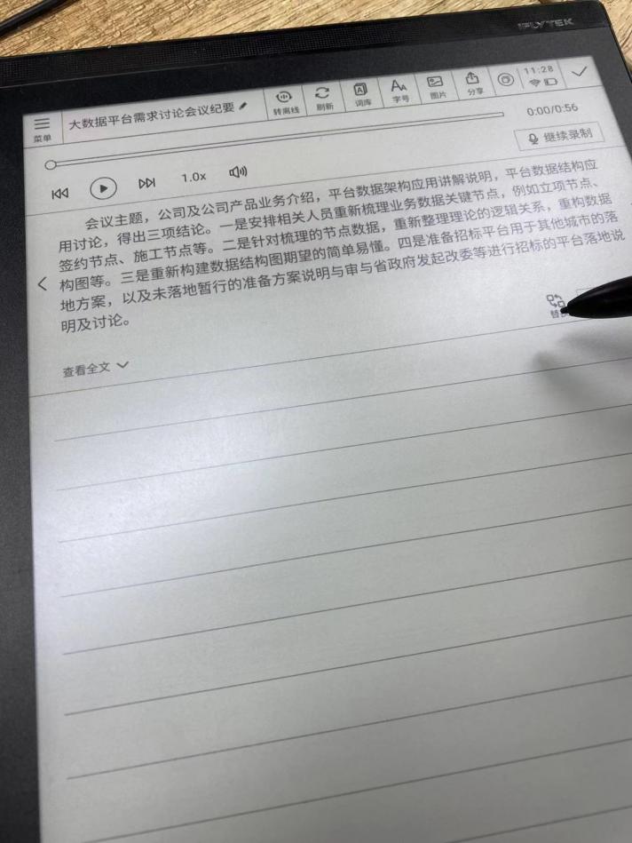 此外,像智能笔记功能也是科大讯飞智能办公本为用户带来的智能化体验。通过智能笔记功能,用户可以在语音转写的同时,在下方记录要点,并能够在结束后做到录音、转写文字、手写要点能够一一对应、字音同步。而且用户也可以通过笔记时间、关键词等特性快速检索。而一些轻办公功能,如支持4G流量、深度适配WPS、无线打印等等一些功能,都能够证明科大讯飞智能办公本在办公能力上不仅有深度而且还有宽度。