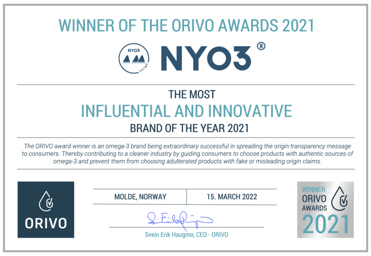 随后,在2021国际磷虾油研讨会上,ORIVO认证中心CTO再次特别提名并表彰了NYO3纯南极磷虾油。凭借对产品品质及标准的严格把控,NYO3最终荣膺ORIVO颁发的2021年度最具影响力和创新奖。