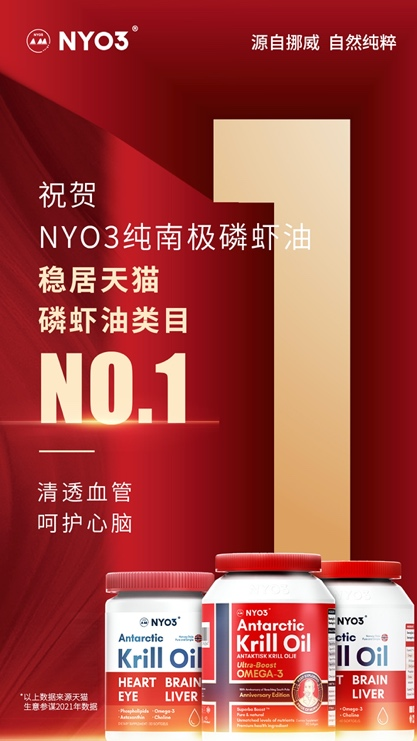自2019年正式登陆中国市场以来,NYO3品牌凭借高口碑及高品质迅速出圈,强势问鼎磷虾油类目销冠。据天猫生意参谋数据显示,2021年,NYO3纯南极磷虾油持续霸榜天猫国际磷虾油类目销量NO.1,NYO3海豹油亦登顶天猫国际细分类目第1,同时火速完成了京东国际、抖音国际等跨境电商平台的入驻,其受消费者信赖及推崇程度可见一斑。