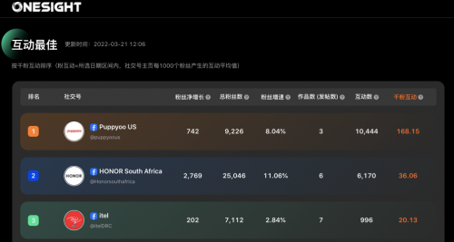 在本期排行中,HONOR South Africa地区账号拥有较高的千粉互动数,成为消费电子分类中Facebook互动最佳排名第二的账号。