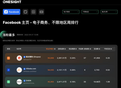 SHEIN一贯以简洁的文案和亮丽的视觉图片引发消费者和用户的关注。在本期排行周期内,SHEIN以超4万的粉丝增长量占据电子商务类Facebook涨粉最多排行第三。