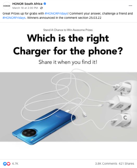 HONOR South Africa 于3月18日星期五发布产品抽奖帖文,以类似于#HappyFridays 和#HappyHours 的Hashtag #HONORFridays 点明“荣耀在快乐星期五送礼”的主题。粉丝只需在评论区评论即可参与抽奖,此举引发了较高的千粉互动。