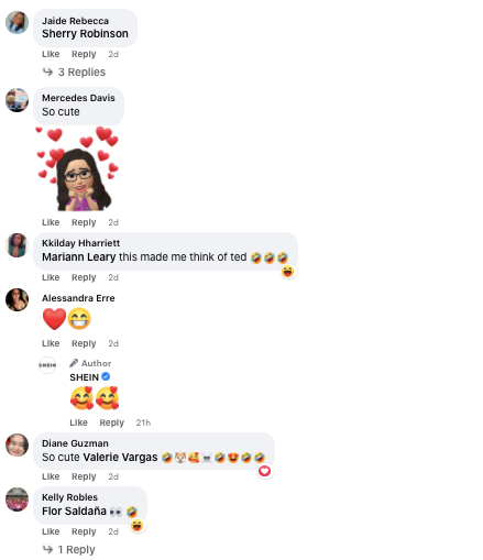 不仅帖文评论区持续不断地收获粉丝的点赞与评论,SHEIN也经常性和适当地在评论区与粉丝进行互动。