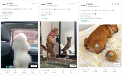 除了日常的服装饰品类帖文,SHEIN还以固定频率穿插发布有关小动物的帖子,以动物营销获取用户的喜爱,引发自主互动。相比其他帖文,这些有关小动物的帖文拥有更高的心情数,也获取了更多评论与分享,成为本期最佳贴文TOP3。