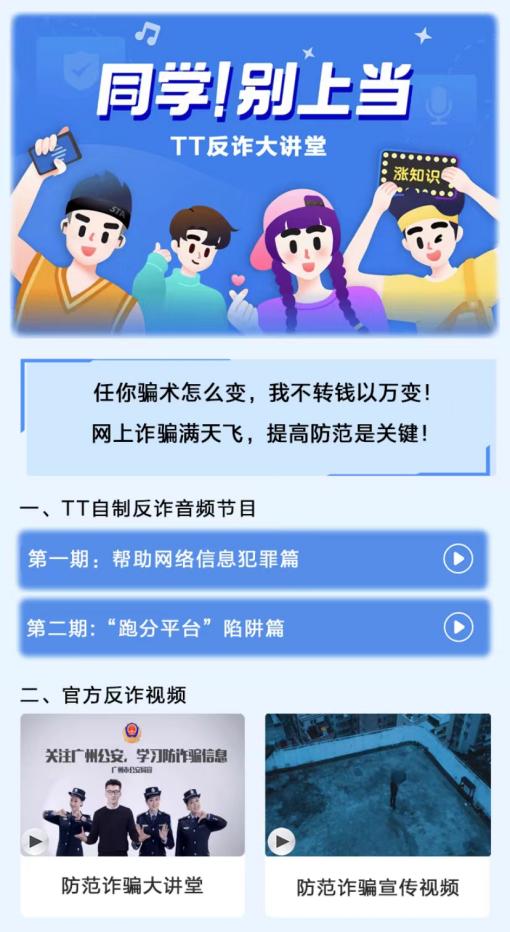 在广州市公安局网警支队指导下,TT语音打造“TT反诈大讲堂”活动,在《同学,别上当》普法内容创作中,充分发挥平台主播力量,以有趣、易懂的方式引导正能量主播创作,以案例讲解、PIA 戏等方式为广大用户普及防诈骗知识,增强自我保护意识。“TT 反诈大讲堂”还增设“官方反诈视频”、“官方反诈漫画”,丰富普法专栏内容,提升专业度。为提高专栏点击率,TT 语音在端内高流量资源位上线专栏且引导正能量主播在日常直播中呼吁用户关注专栏内容,专栏上线仅 2 周,累计点击率超 20 万,获得各界一致好评。