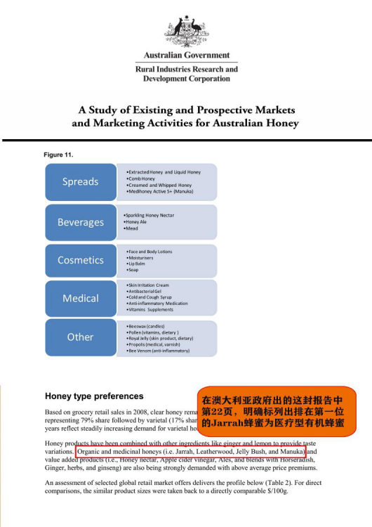 蜂蜜的消炎外敷用法很少被提及,甚至被忽略。大部分成熟的蜂蜜一般都具有杀菌消炎的作用,但在澳大利亚政府的相关报告中,明确标列出赤桉树蜂蜜为医疗型有机蜂蜜。菲斯特农场(Fewster‘s Fram)赤桉树蜂蜜在澳洲直接引起热潮并脱颖而出,成为蜂蜜界的“王者”。
