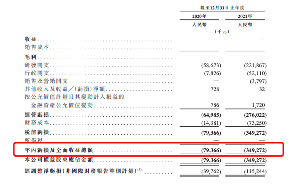 招股书显示,在过去的2020年和2021年两个财政年度,精锋医疗未有业务收入,相应的研发开支分别为0.59亿元和2.22亿元人民币,而净亏损分别达到了0.79亿元和3.49亿元人民币,有持续扩大的趋势。