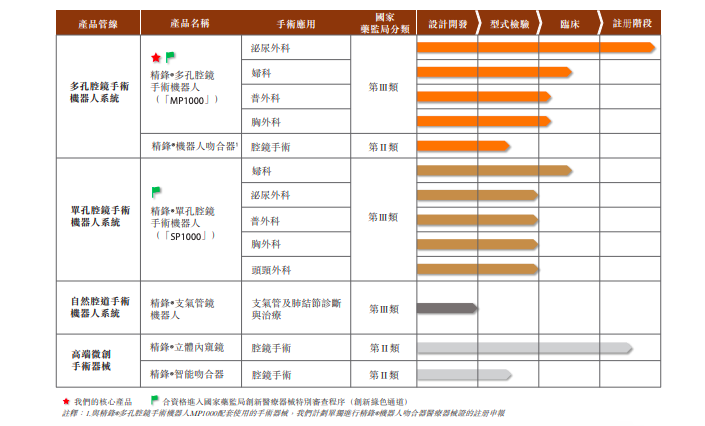 目前,精锋医疗已完成精锋多孔腔镜手术机器人MP1000及精锋单孔腔镜手术机器人SP1000的设计及主要研发,两款核心产品均具备通过绿色通道进行国家药监局有关创新医疗器械的快速审查资格。