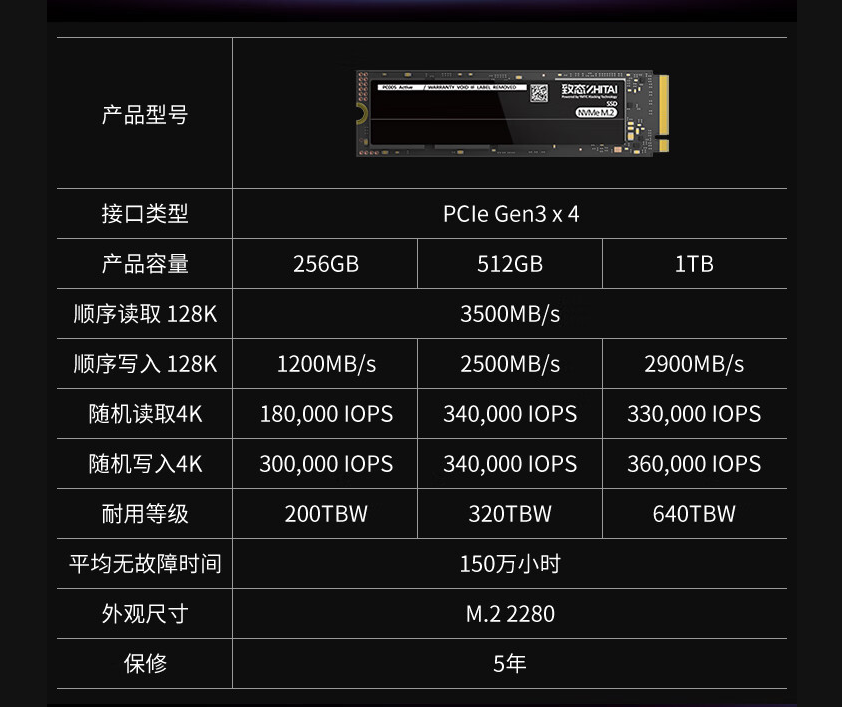 在品质和售后方面致态也是不遗余力,除了自身基于原厂颗粒的品质保障外,还为全系产品提供了150万小时的平均无故障时间及5年质保。我手里这块1TB版本的PC005 Active更是拥有640TBW的耐用等级表现,即便每天写入100GB数据,写入寿命也远超质保期限。