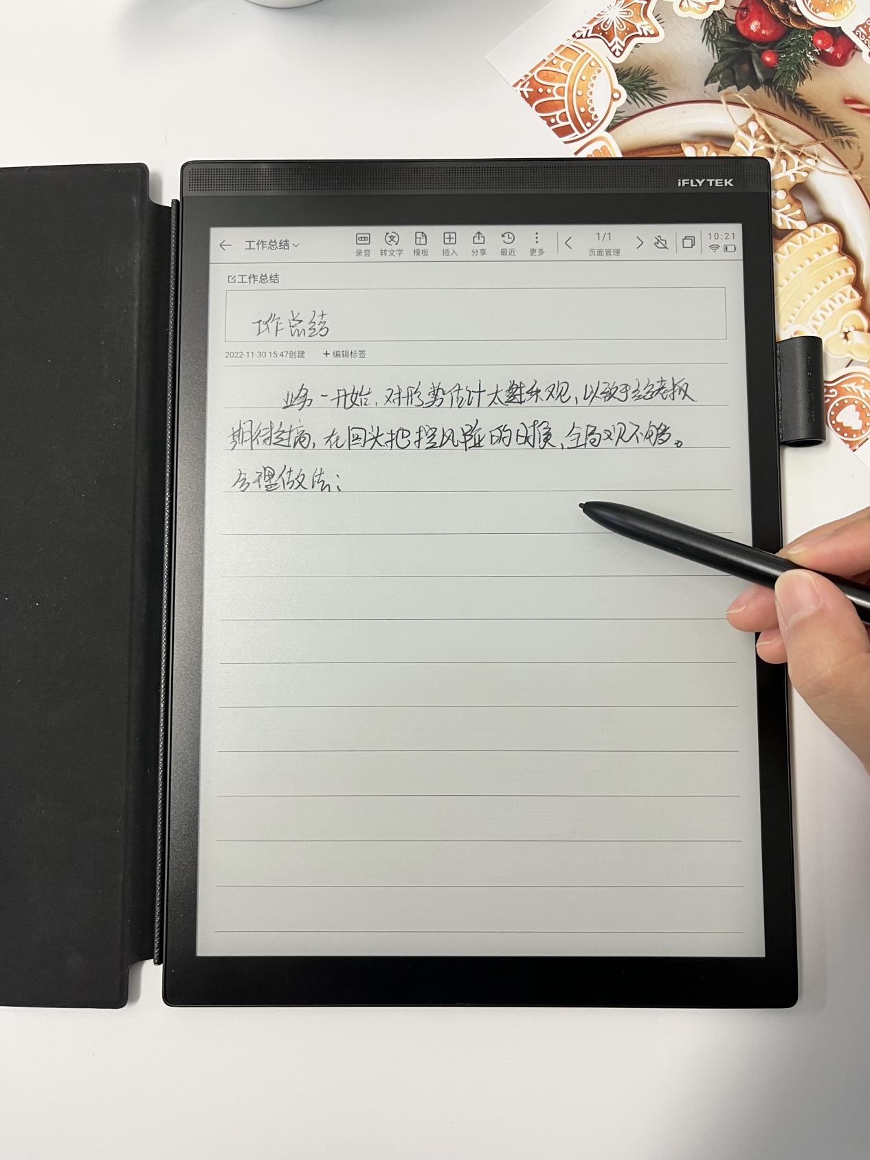 其次就要夸夸他流畅的书写体验了,凭借着10.3英寸E-Ink柔性墨水屏与0.1mm悬空屏专利技术,让阅读与书写都具有纸质手感。搭配的Wacom讯飞定制电磁笔,通过精心地调校屏笔摩擦,使得电磁笔书写也更为流畅。使用的T-1000显示芯片,屏幕刷新率更高、延迟感更低,书写流畅自然。
