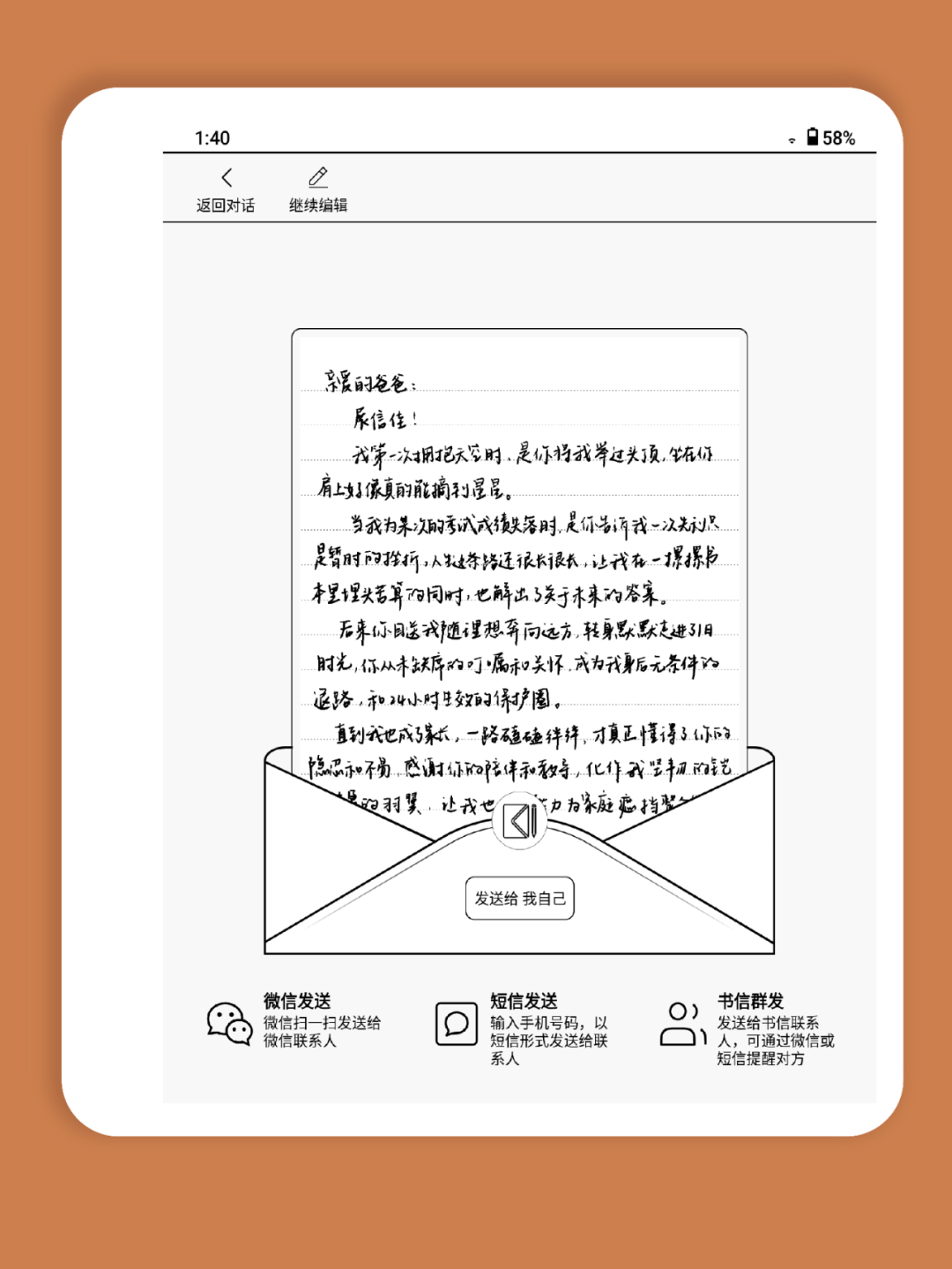 与此同时,汉王书信APP还支持非电纸本的多种传输方式,可以将亲笔信通过微信,短信等方式,发送给同事同学、亲朋好友,即使对方没电纸本,一样可以收到你亲笔写的手写信。如果你的汉王书信APP绑定了微信,还可以随时随地收到微信提醒,并支持扫码添加对方为书信好友。此外,汉王书信APP还可实现对非手写类的文件、文本、图片等的传输。
