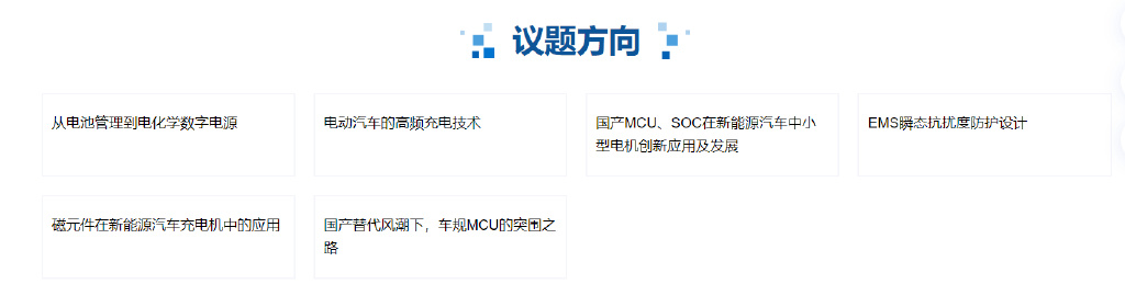 届时,将会有来自浙大、同济大学长期研究新能源汽车充电与BMS技术专家以及博世、电装、大陆集团、法雷奥、联合电子、德尔福等汽车电子厂商针对从电池管理到电化学数字电源、电动汽车的高频充电技术、国产MCU、SOC在新能源汽车中小型电机创新应用及发展、EMS瞬态抗扰度防护设计、磁元件在新能源汽车充电机中的应用、国产替代风潮下,车规MCU的突围之路等议题展开深入探讨。为大家带来新能源汽车关键元器件的最新技术和应用方案,为新能源汽车产业技术升级赋能。