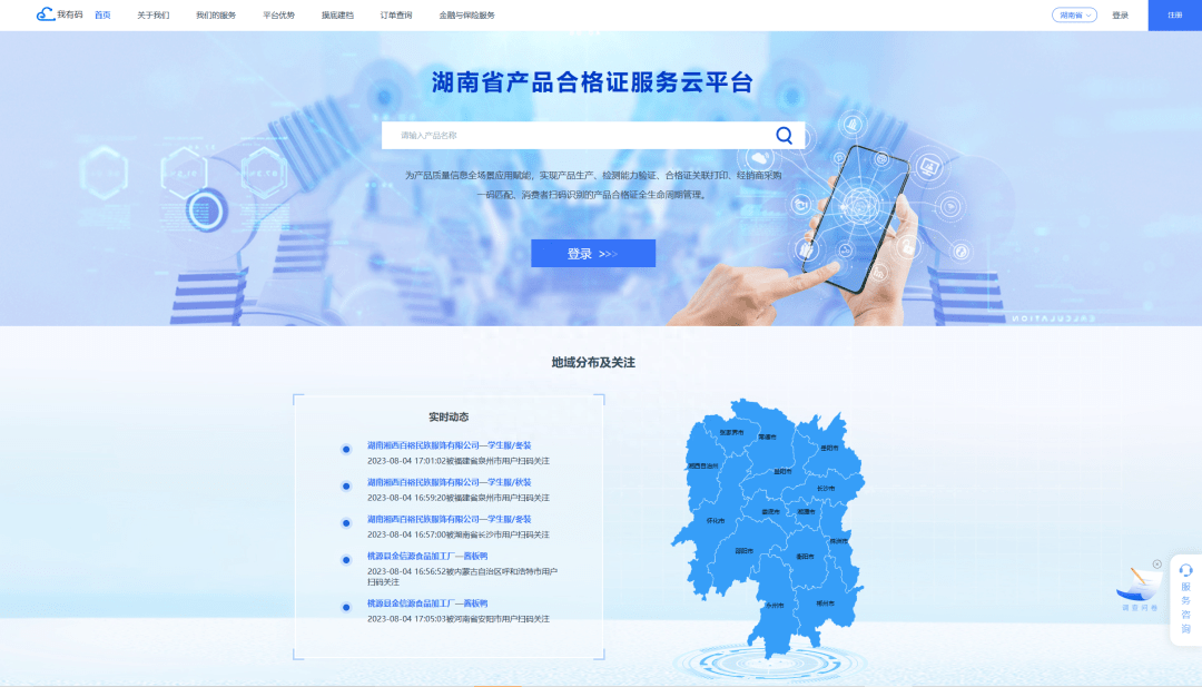 湖南省产品合格证服务云平台是湖南航天下属湖南航天天麓公司运用新一代信息技术赋能产品合格证,助力企业数字化转型构建的云上数字服务产品。湖南航天是高新技术企业、国家新材料测试与评价平台区域中心承建单位,国内云检测新业态的探索者和引领者,公司运用新一代信息技术打造的“产品合格证云平台”,提供产品质量全链条追踪追溯服务。
