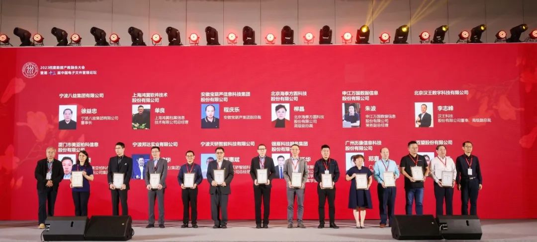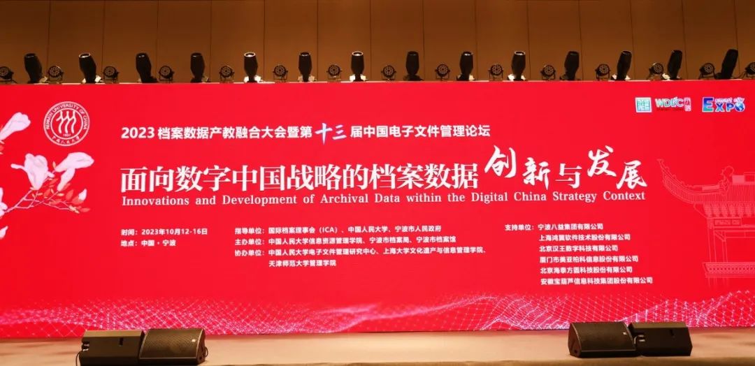 10月14日,由国际档案理事会、中国人民大学、宁波市人民政府指导,中国人民大学信息资源管理学院、宁波市档案局和宁波市档案馆联合主办的2023档案数据产教融合大会暨第十三届中国电子文件管理论坛开幕式在浙江宁波成功举办。本次会议以“面向数字中国战略的档案数据创新与发展”为主题。来自党政机关、企事业单位、高等院校、科研院所、档案信息技术公司的约500位专家学者、嘉宾代表相聚甬城,分享档案数据治理和管理的最新理论见解和一线实践经验,共商档案数据产教融合的路径和方法,展望档案事业现代化的图景,汉王科技全程深度参与本届大会及论坛的各项活动。
