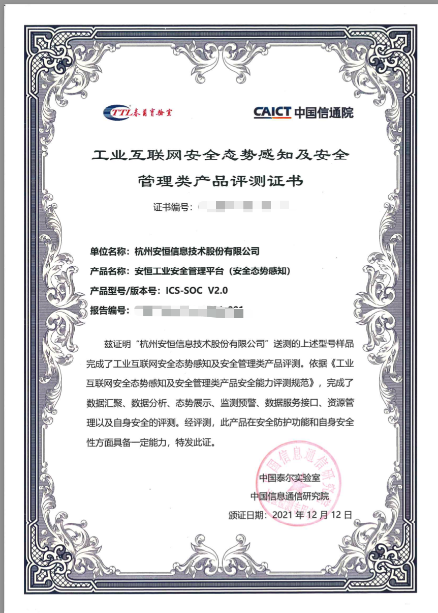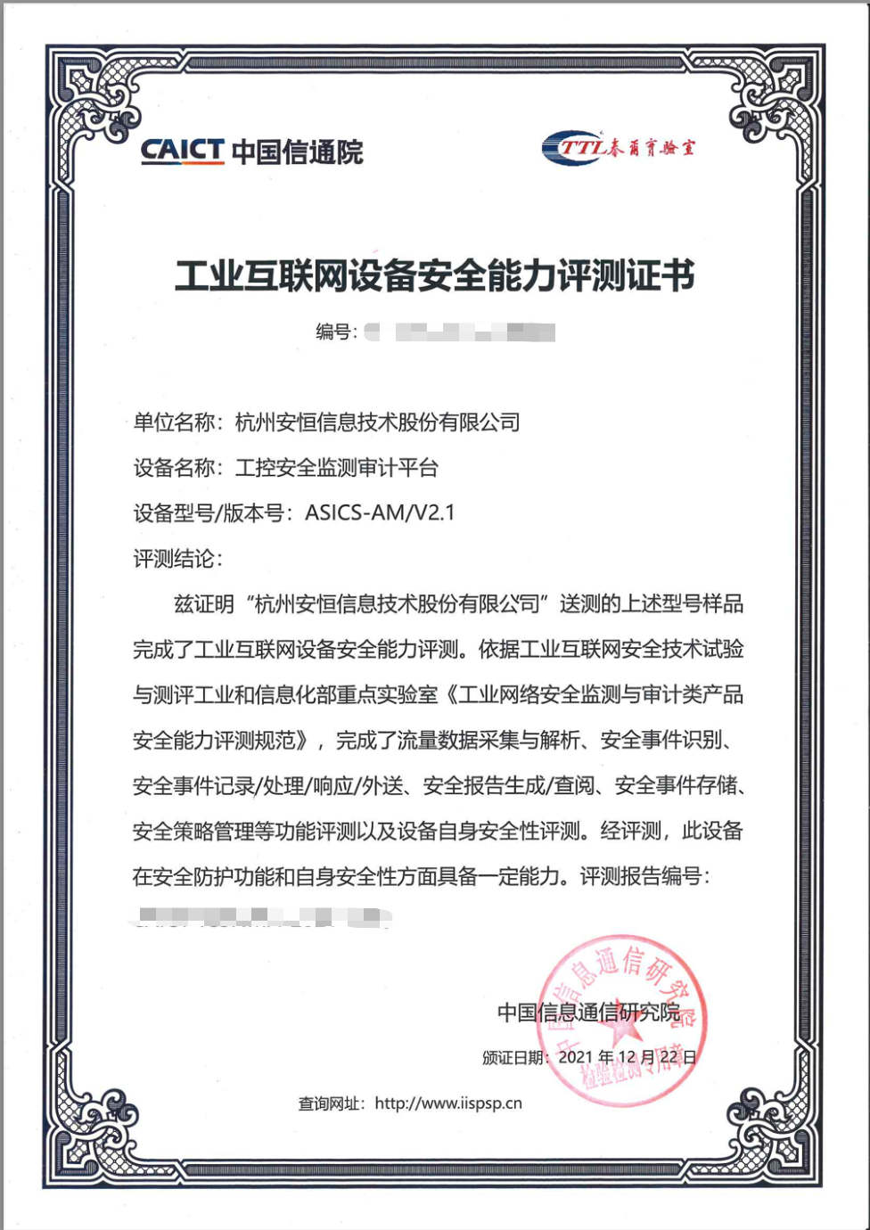 近日,由中国信通院,依托工业互联网安全技术试验与测评工业和信息化部重点实验室,启动的“工业互联网设备安全性评估评测征集(第二批)”活动结果公布。来自安恒信息的“安恒工业安全管理平台(安全态势感知)”和“工控安全监测审计平台“成功入选。