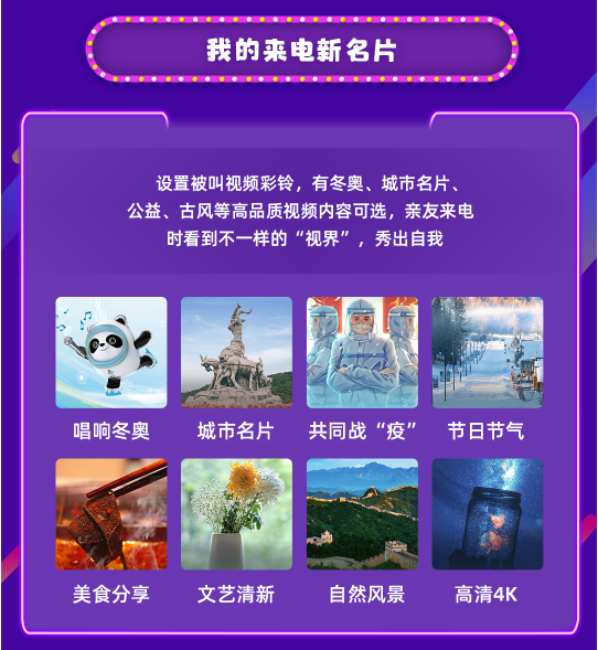 视频彩铃百变会员面向用户开放被叫彩铃随心设特权,畅享海量视频彩铃内容库。从“金虎闹春,视频贺卡送祝福”、“三亿人上冰雪”、“冬奥之梦”等时事热点节点主题彩铃,到祖国历史名胜、萌宠搞怪日常、爆红IP角色、优质明星偶像等等,全方位打造多元化内容,满足用户设置需求。