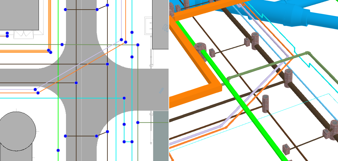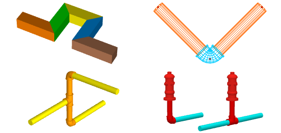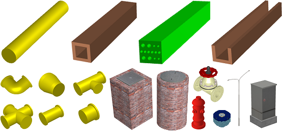模型库方面,管线模型除支持常见的圆管、方管外,还提供了对排管、明沟两类管线的支持。排管是截面带孔的方形管块,主要用于通信管线。明沟是无顶盖的方管,用于室外排水管线。管点模型有解析建模和外部导入模型两种。解析管点建模根据管点的自身的属性及与管线的连接情况,实时构建出符合实际形状、大小的模型,包括弯头、直通、三通、四通、变径、立管组件、方井、圆井、雨水篦等设备类型。外部导入模型是由其它软件已经制作完成,可直接导入显示的模型,主要包括阀门、水表、消防栓、路灯、接线箱和控制柜等,支持按需追加外部模型。外部模型在参与建模时,会顾及与管线的连接情况,对模型大小、方向等进行适当调整。