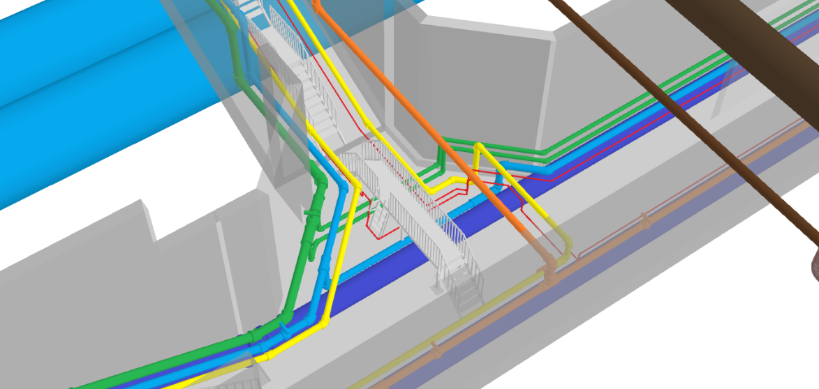 三维管线模型与地下设施模型(如地下管廊)相结合,可完整体现管线在管廊中的排布、走向、与楼梯和防火门之间的位置关系。尤其适用于显示空间分布较复杂的管线,提供全方位观察能力。