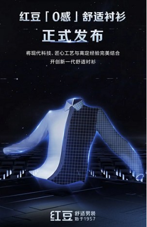 怎样让更多的人拥有更高品质更舒适的好男装一直是红豆孜孜以求的目标。始于1957年,红豆专注舒适男装65年,迄今已积累了128项专利技术,衬衫和西裤连续6年全国销量领先,衬衫销售累计超2亿件,拥有300万亚洲男士人体数据,积累了168种剪裁版型。基于65年的原料技术和大数据积淀,红豆推出0感衬衫,声称几乎解决了现有衬衫普遍存在的易皱、易变色、无弹力、透气差、质感硬、不贴身等所有痛点。