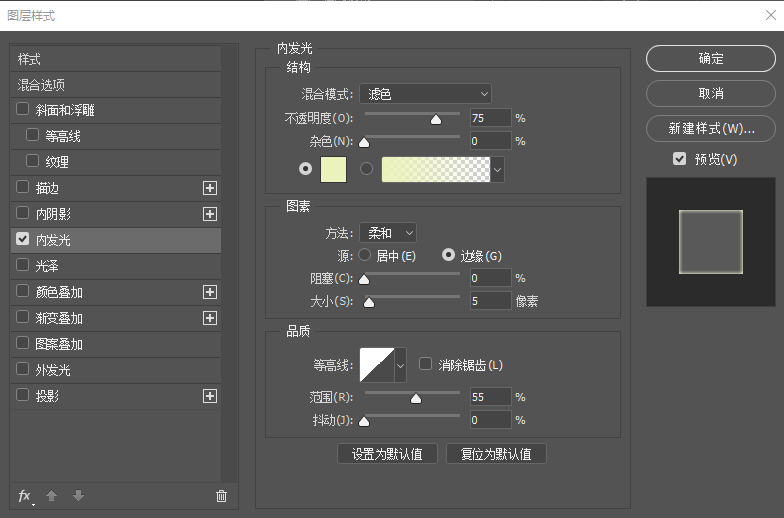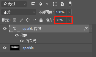 显示拷贝的图层文字,双击添加图层样式——内发光,参数设置如图。然后将拷贝的文字“填充”改为30%,如图。