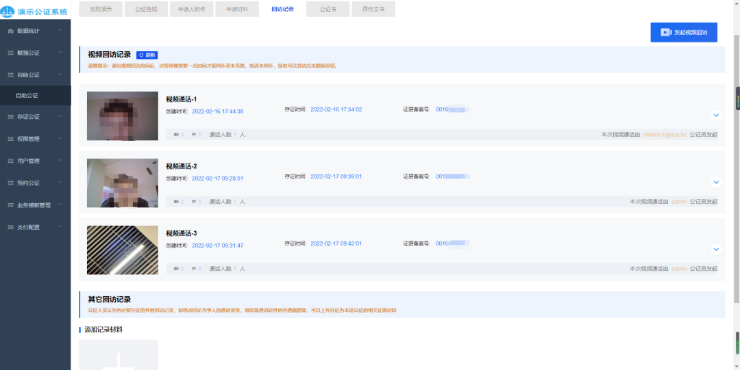 公证员发起视频回访,申请人通过手机短信链接进入视频连线,公证员在线进行公证业务问询,通话完成后,整个通话过程的(时间、视频记录和实录截图、其他通话录音、微信沟通截图)等相关证据材料,实时同步权威司法机构节点进行区块链存证,通过“证据备案号”可实时在线查询、验证,还可在线下载证据包,确保视频公证的合法性与真实性的同时,提升公证业务办证效率。