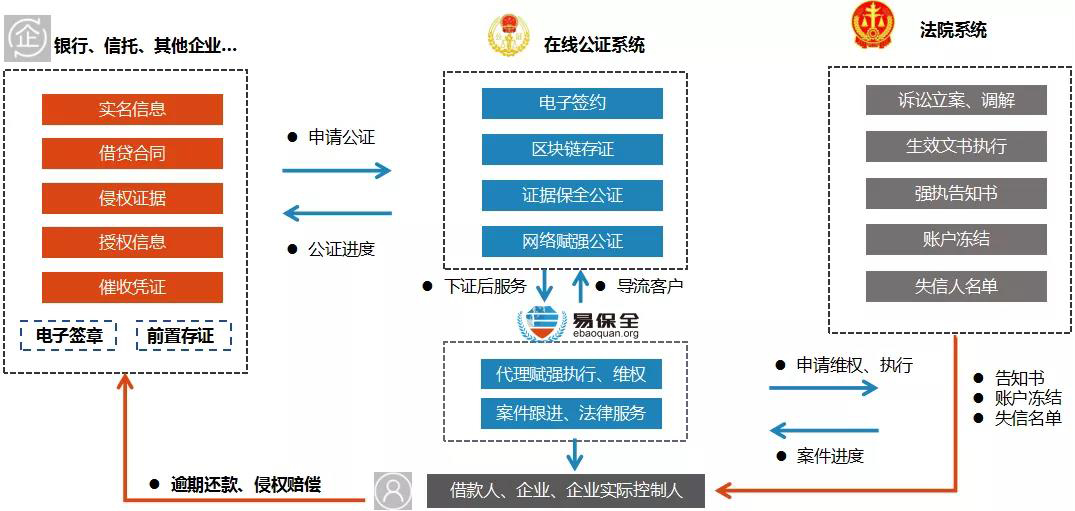 易保全凭借“互联网+区块链+电子签章”技术,将公证处现有的线下赋强公证业务办理,移植到互联网上,公证处通过互联网就能实现债权文书网上赋予强制执行效力,免诉执行,高效率处置纠纷。