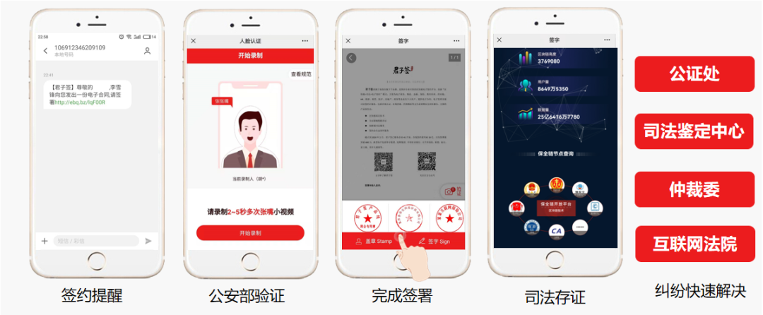 在交易前期,提供合法可靠的身份认证服务,保障交易各方的真实身份及真实意愿;在交易中,提供合同编辑、合同签发、合同审批、印章管控等全套电子合同签署服务,并对整个签署过程提供区块链存证服务,将需要存证的合同数据以HASH值的形式存储到区块链上,确保合同数据不被篡改,证据真实有效,在交易后,如发生纠纷,提供完善的司法服务,可在线申请出证、在线公证、仲裁等服务,有效保障合法权益。