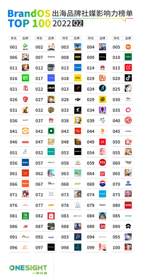 2022Q2《BrandOS TOP100 出海品牌社媒影响力榜单》(以下简称BrandOS榜单)如期发布!
