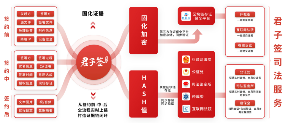 君子签深耕电子签名行业多年,创新“区块链+司法+电子签约”模式,联合易保全电子数据存证机构、司法机构等,将区块链存证、电子签约和司法服务相结合,让每一份电子合同数据成为可靠有效的电子证据。