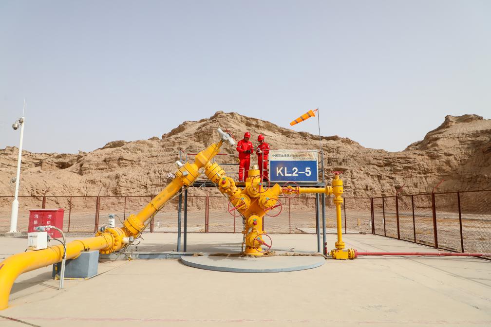 图为中国石油塔里木油田职工正在克拉2-5井巡检。(马博 摄)