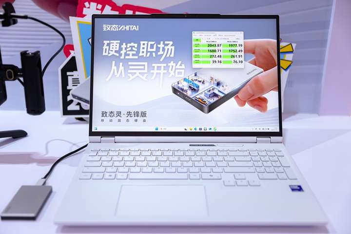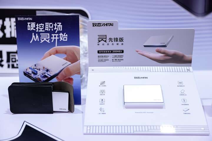 在致态展台,最受关注的自然就是拥有超高速度的致态灵先锋版移动固态硬盘,这是一款专门为商务人士打造的超高速移动固态硬盘,采用银白色的铝合金材质,重量大约为60克,几乎没有负重感,移动固态硬盘拥有1TB以及2TB两个规格的容量,以满足不同消费群体的需求。
