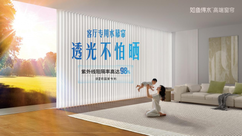 客厅是家庭核心互动空间,然而现代客厅正面临双重挑战,既向往明媚阳光洒满客厅,却又饱受紫外线侵蚀与隐私暴露的困扰,而传统纱帘此时却陷入了两难的困境。洞悉这一深层需求,如鱼得水在客厅系统解决方案中推出客厅专用水幕帘,以繁花似锦及盛世华章两大系列产品为代表,采用抗紫外线专利技术,有效阻隔高达98%的紫外线,同时以品牌专属面料完美兼顾自然采光与隐私保护,实现透光不怕晒的健康新体验,让阳光成为滋养身心的健康光源而非肌肤杀手。同时以161.8°黄金弧度升级了水幕帘工艺,赋予纱帘如水幕般的垂顺美感。