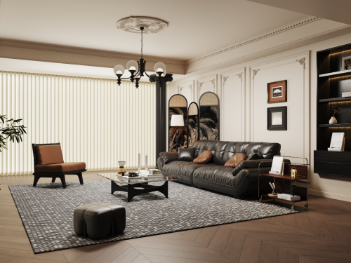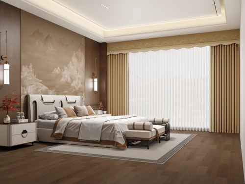 春眠-观山:设计灵感来源于中式山海,窗幔用双色刺绣生动描绘了群山起伏,主帘采用精致的立边工艺,皮革编织花边穿越层层小袢,打造出既具有东方韵味,又不失现代感的空间氛围,适用于现代中式的意境空间。