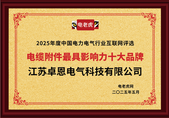 近日,江苏卓恩电气科技有限公司凭借其在电缆附件领域的卓越表现,荣获“电缆附件最具影响十大品牌”荣誉称号。这一殊荣不仅彰显了企业在行业内的领先地位,也进一步巩固了其作为高新技术科研企业的市场影响力。