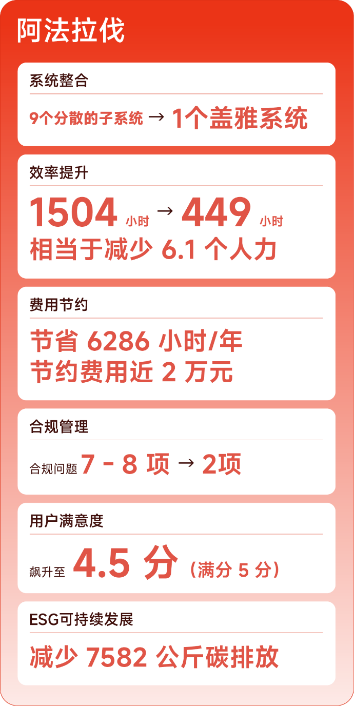 从系统整合来看,九个分散系统整合成一个盖雅系统,数据出错率大幅降低,用户满意度飙升至 4.5 分(满分 5 分)。