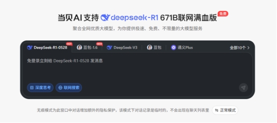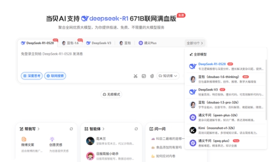 凭借底层架构优势,当贝AI成为首批接入DeepSeek-R1 0528模型的国内平台,并持续扩展模型库。它支持多模型动态协同,集成了DeepSeek-R1 671B(满血联网版)、DeepSeek-V3、通义千问、豆包1.6等10余款主流模型,覆盖编程调试、科研文献解析、创意写作等场景,用户可“一键切换”以适配不同任务需求,有效解决了单一模型在垂直领域的能力断层问题。此外,当贝AI还提供了AI智能体、无痕模式、“帮我写”等符合用户需求的功能。