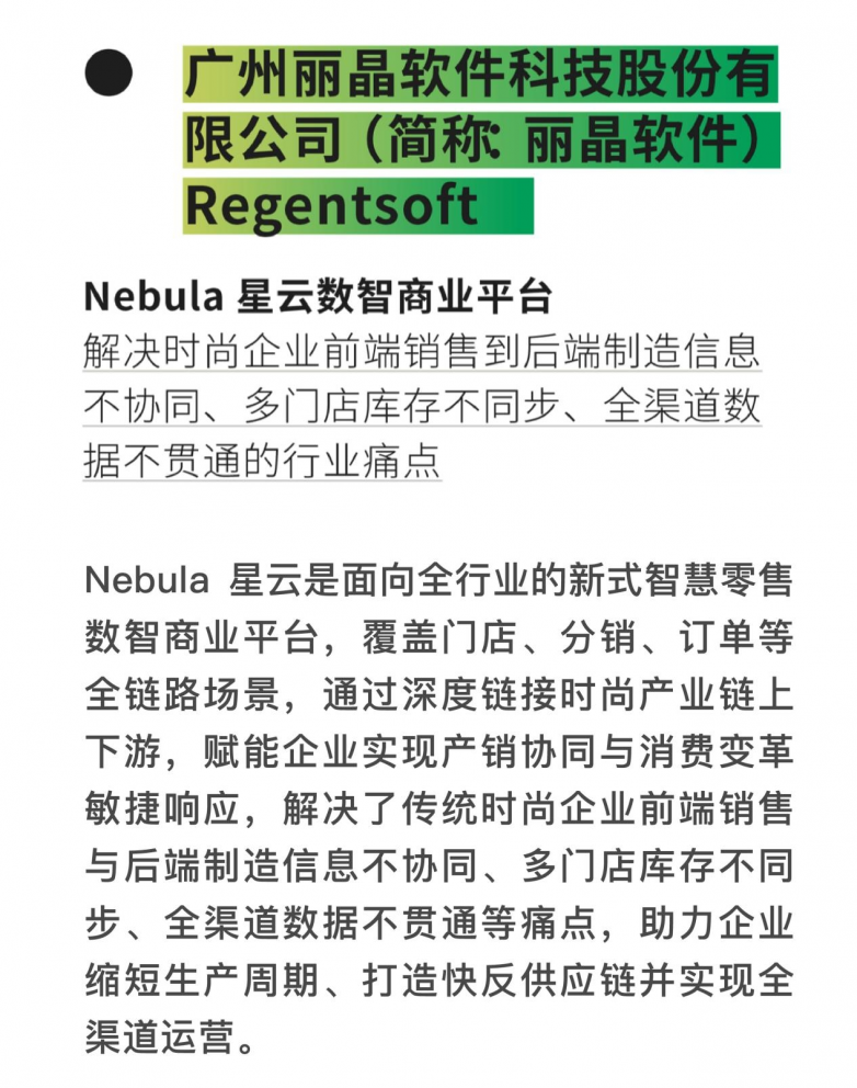 此次荣登WWD「Sustain 100可持续创意榜单」,是对丽晶软件长期以来深耕时尚产业数字化、以科技驱动产业升级与全球化拓展的又一次有力背书。“Nebula 星云数智商业平台”不仅有效助力时尚企业构建柔性快反供应链、缩短生产周期、实现全渠道一体化运营及全球化敏捷布局,其通过优化资源配置、显著减少库存积压所贡献的综合价值,正是获得“Sustain 100”青睐的关键所在。丽晶软件正以实际行动为时尚产业的效率革命、绿色转型与全球化跃升提供强大引擎。