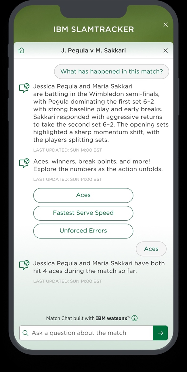 Match Chat功能基于watsonx Orchestrate平台构建,并引入了AI智能体和IBM Granite在内的大语言模型(LLM)等AI技术;上述模型经过了温网编辑风格和网球语言的训练。球迷也可在赛后通过数字赛事中心IBM Slamtracker,在部分重要比赛的页面中使用Match Chat功能。