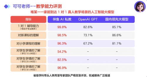 报告显示,可可老师在 “新课标理解” 维度达 98.5%,较 GPT 高出 15.9%,尤其在小学课程知识点的拆解上(如数学广角、语文阅读理解策略)表现突出。更具突破性的是其动态学情分析能力:学生学习 10 小时后,可可老师对学情的了解度达 54.2%;30 小时后提升至 96.9%,能精准识别 “抽屉原理应用”“行程问题中的中点陷阱” 等高频薄弱点,而传统大模型在此维度尚未形成量化能力。