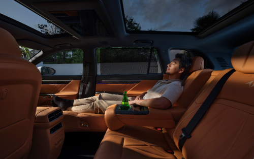 如果说宽敞空间是eπ008的基础,那么其灵活的空间变换能力则堪称亮点。eπ008五座版配备二排电动魔毯座椅,四分、六分腿托可独立调节。后排腿托完全升起可形成长达1.5米的休息空间;长途旅行时,副驾放平配合后排左侧腿托升起,能组合成同级最长的2m+副驾L型贵妃榻,方便宝妈陪伴孩子休息;最令人惊喜的是,后排座椅完全放倒后,车内可形成同级唯一的2.4米超大双人床空间,轻松转变为房车模式,满足露营观星等家庭需求。