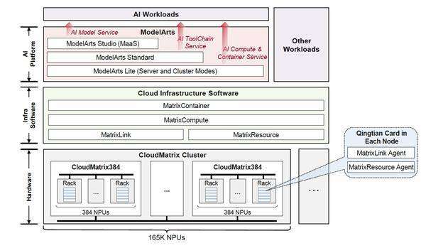 在CloudMatrix384之上,华为云提供了MatrixCompute、MatrixLink、MatrixResource、MatrixContainer等云软件服务,再搭配ModelArts,向上支撑各类AI工作负载。当前,昇腾AI云服务已为超过1300家客户提供AI算力,加速千行万业智能化升级。新浪与华为云深度合作,基于CloudMatrix384昇腾AI云服务,为“智慧小浪”智能服务体系构建了统一的推理平台,底层由昇腾AI算力提供支持,推理的交付效率提升了超过 50%,模型上线速度成倍加快,通过软硬协同调优,NPU利用率提升超过40%。