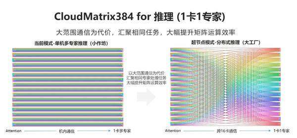 例如:传统集群模式下进行推理,将一个复杂问题拆分为若干个子问题,然后在每一张单卡上分配了所有的“专家”,每个“专家”都要将所有相关子问题都运行一遍,然后再将总输出结果组装起来,导致每一张单卡的每一个“专家”只能获得少量的计算和通信能力,这就是一卡多专家的“小作坊模式”;而超节点“工厂”里每一张单卡上只分配一个专家,通过全局对等网络将所有相关问题都汇集给同一“专家”,同一“专家”集中处理所有相关子问题后再返还给系统进行最后的组装,显然单卡的MoE计算和通信效率都大幅提升了。