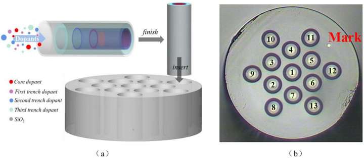 图1. 13芯光纤的研制,(a)光纤预制棒制备流程,(b)实验制备的光纤端面
