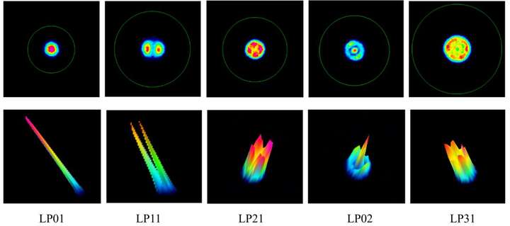 图2.实验观测到的13芯光纤中的5个LP模式的2D和3D图