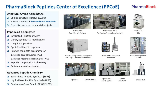 药石科技PPCoE(PharmaBlock Peptides Center of Excellence)团队依托超1万种非天然氨基酸库(1300种常备库存),提供从分子设计到商业化生产的端到端服务。团队擅长化学合成与生物催化双路径制备非天然氨基酸,可快速构建复杂结构(如三元环、桥环化合物),单批次生产超100公斤的化合物超20个,其中某些五元环产品年产可达5-10吨。多肽合成覆盖线性肽、环肽、PDC/PRC等类型,采用固态多肽合成 (Solid-Phase Peptide Synthesis, SPPS)和液相多肽合成(Liquid-Phase Peptide Synthesis, LPPS)技术,正推进连续流平台实现大规模生产。