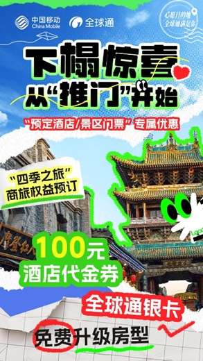 下榻惊喜,从“推门”开始: 在平遥古城旁选了一家口碑不错的客栈,通过APP里的“四季之旅”商旅权益预订。不仅享受了85折,还用掉了之前领的100元酒店代金券!办理入住时,前台小哥微笑着说:“女士您好,识别到您是尊贵的全球通银卡用户,我们为您免费房型升级到了景观更好的庭院房!”爸妈走进房间时惊喜的笑容,瞬间觉得这“全球通”的身份,值了!
