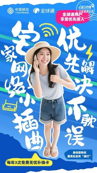 ·宅家网络“小插曲”?优先解决不耽误! 旅行归来第二天,正想整理照片发朋友圈,家里宽带突然“罢工”!假期最后一天可不能没网啊!立刻拨打10086(作为全球通用户,享受优先接入,没等多久就接通了!),客服迅速登记并备注了“全球通用户优先处理”并预约了营业厅的补卡服务。下午,智家工程师就高效上门搞定了故障。从旅途到归家,无缝衔接的顺畅体验,全球通安排得明明白白!