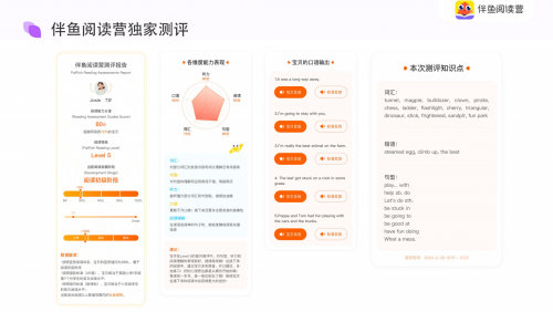 Ryan 的妈妈至今记得查分那天的激动:“7 月 KET 成绩出来是‘卓越’,比预估高了 30 分!” 这个五年级男孩曾对英语阅读极度抗拒,暑假加入伴鱼阅读营后,L3 级的《丽声冒险故事岛》成了 “突破口”——Tina 大王的讲解让冒险情节活了起来,AI 跟读功能让他敢开口了,三个月读完 120 本书后,不仅词汇量从 1200 涨到 2500,还主动用英文写起了小故事。“以前是催着读,现在是追着问‘明天读哪本’,” 妈妈笑着说。