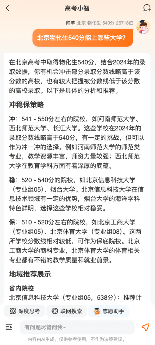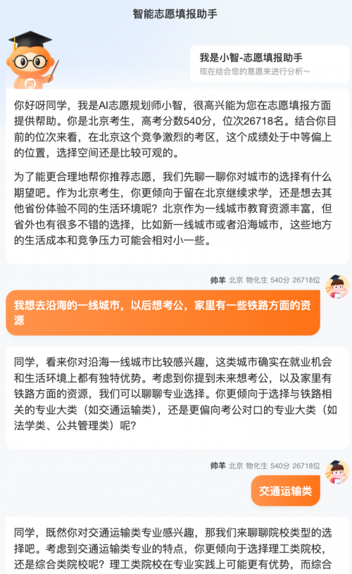不同于传统咨询的模糊建议,【高考小智】整合覆盖全国2800余所高校的历年录取分数线、招生计划、位次排名等核心数据,能够智能匹配考生的分数、位次与潜在院校专业组合,并输出基于历年数据的录取概率预测。