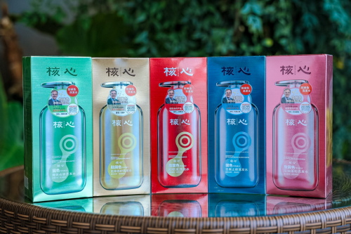 从左至右依次为:核心肽固色清爽去屑洗发水、核心肽固色虫草修护洗发水、核心肽固色防断发洗发水、核心肽固色去屑止痒洗发水、核心肽固色控油蓬松洗发水